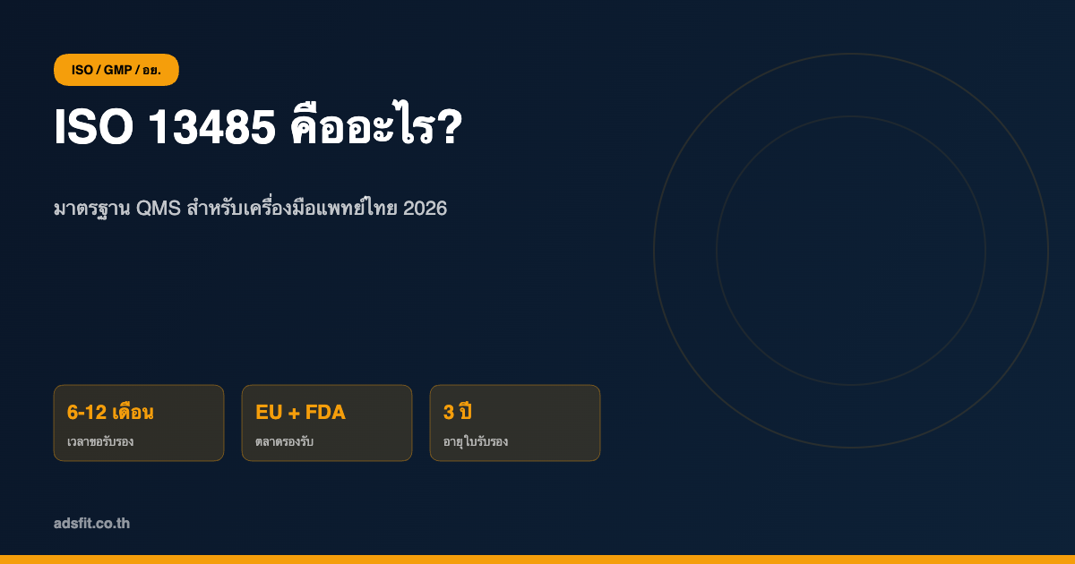 ต้องการความช่วยเหลือในการเตรียมตัวขอรับรอง ISO 13485 หรือมาตรฐาน Compliance อื่นๆ? ทีม ADS FIT มีประสบการณ์ช่วย SME ไทยผ่านการรับรองมาแล้วหลายราย [ติดต่อเรา](https://www.adsfit.co.th/contact) เพื่อรับคำปรึกษาฟรี หรืออ่านบทความ Compliance เพิ่มเติมที่ [adsfit.co.th/blog](https://www.adsfit.co.th/blog)